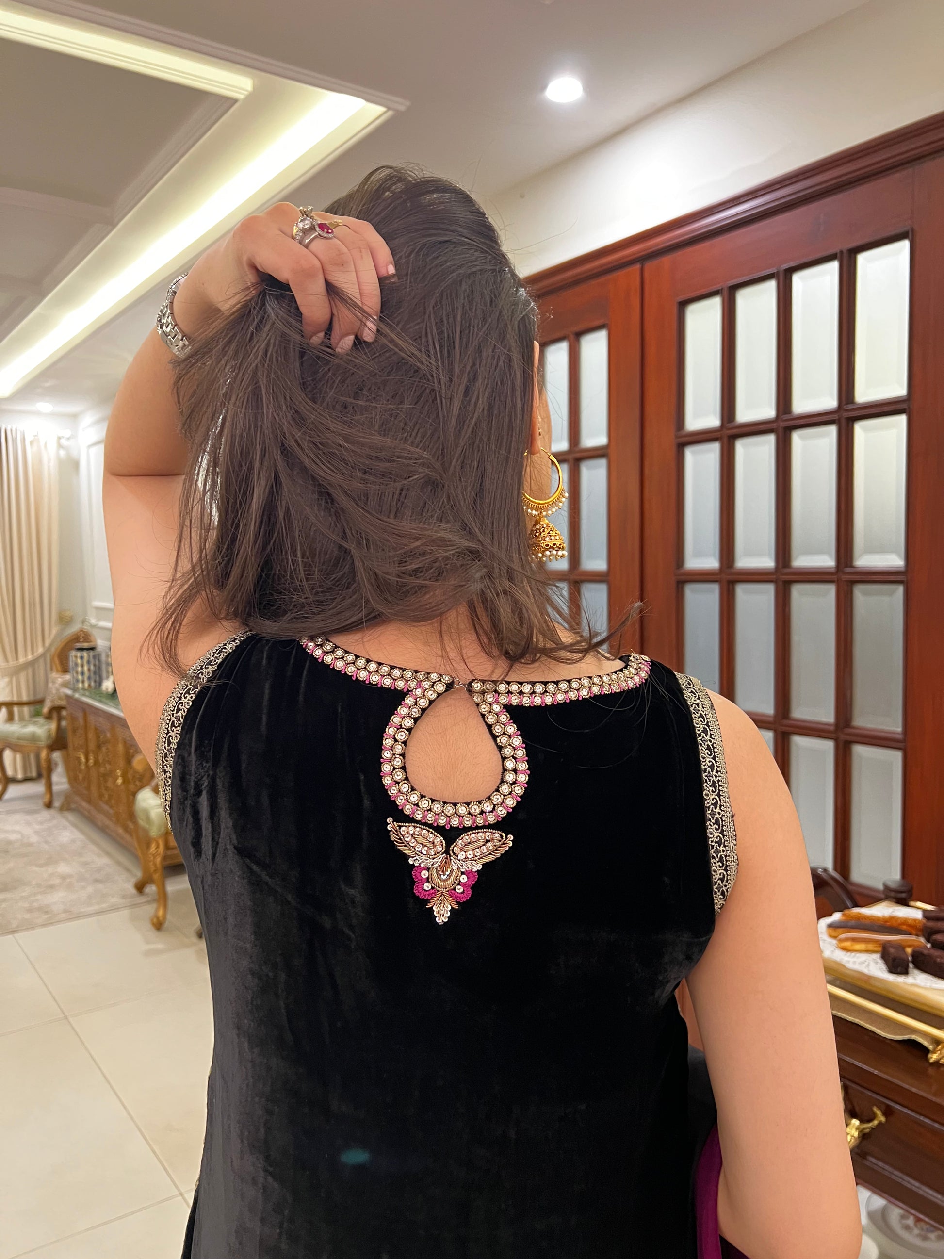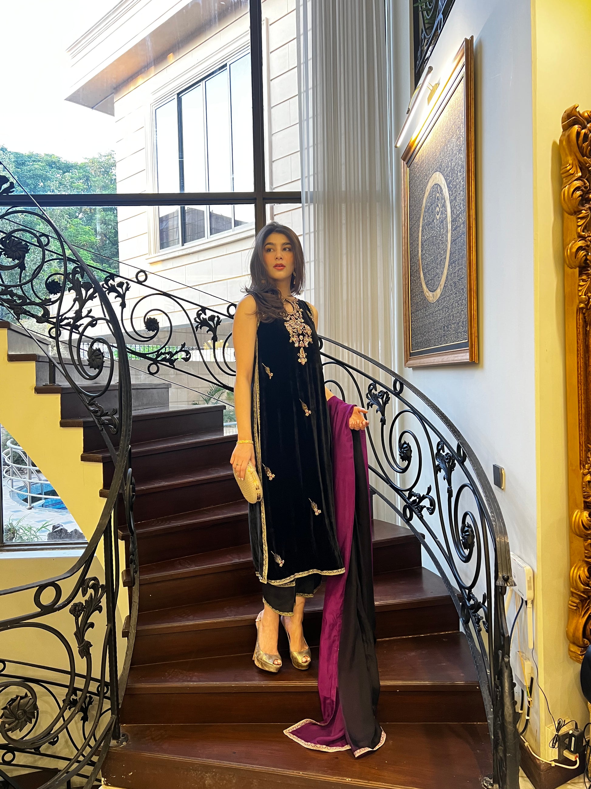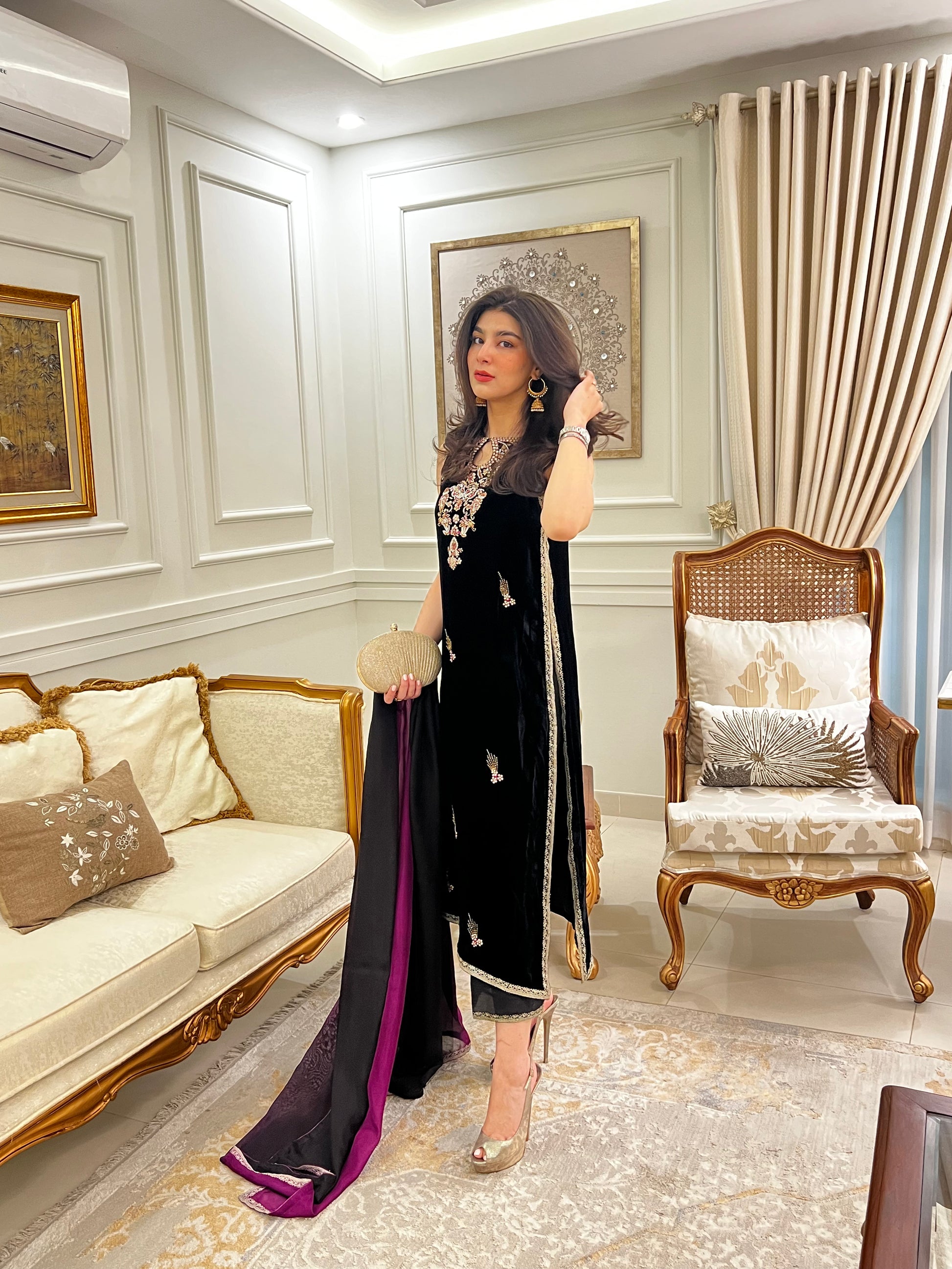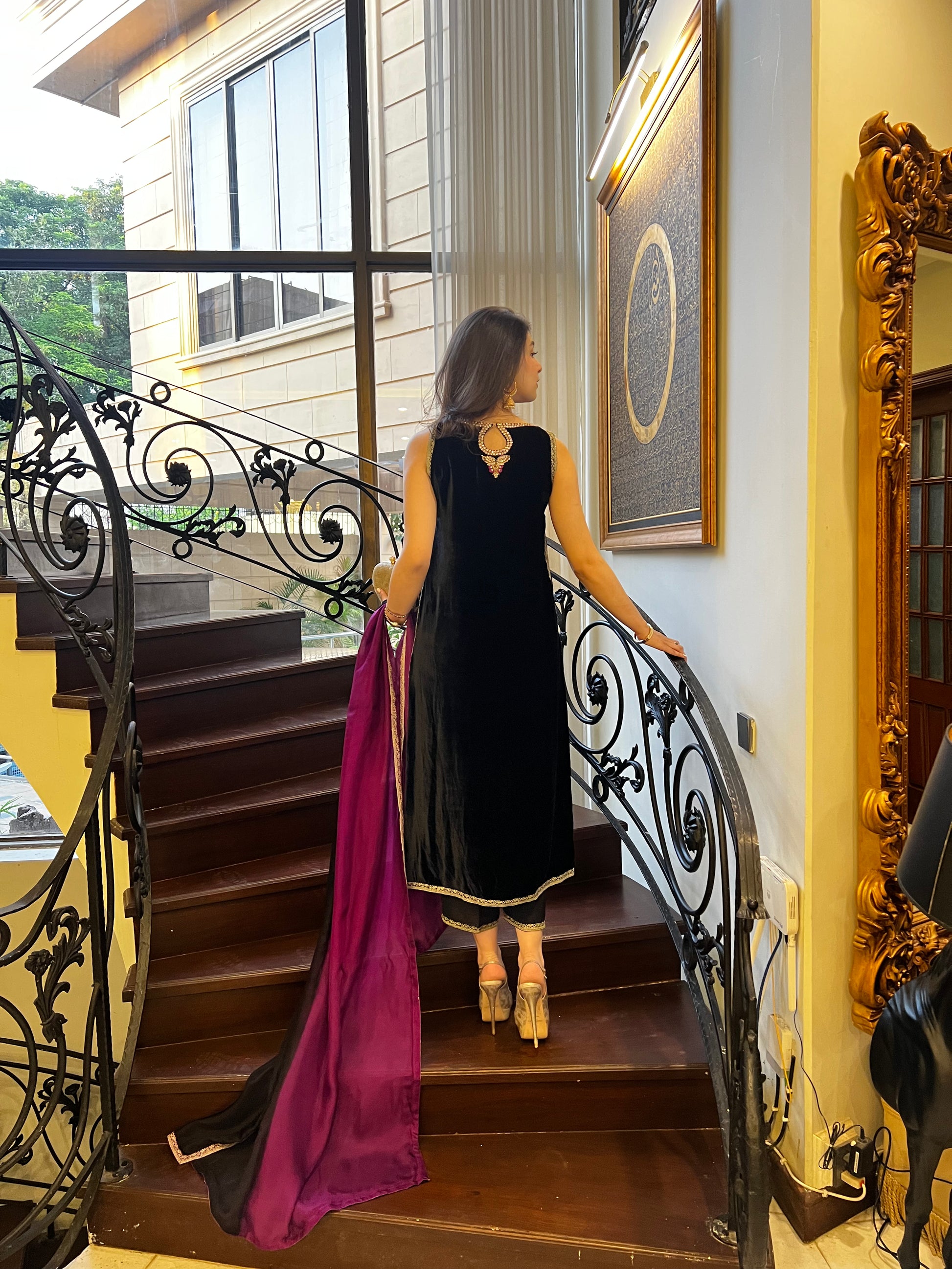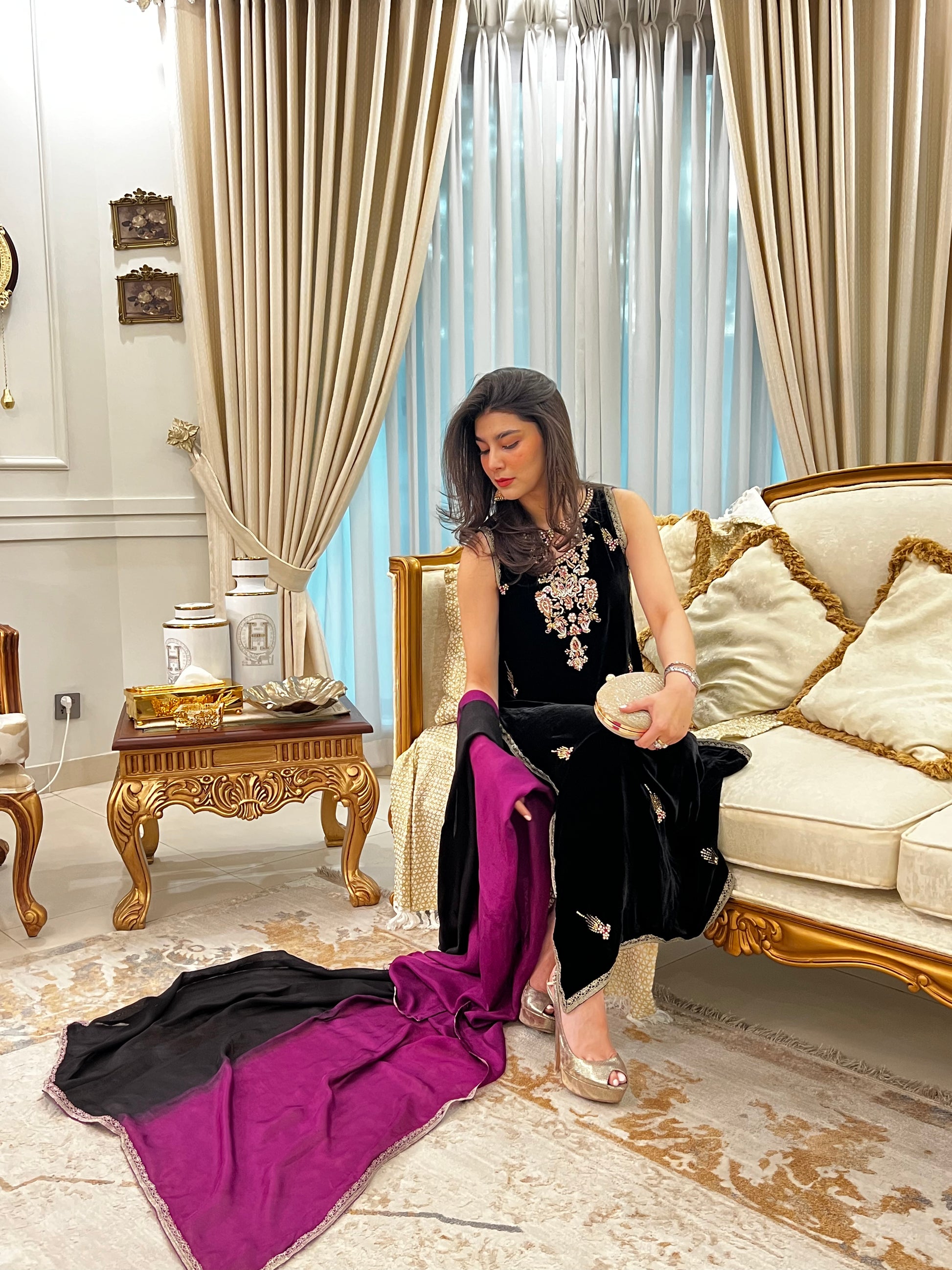 This forever flattering silhouette is cut from plush velvet in jet black color. Adorned with intricate hand embroidery and gold embellishments on the neckline, slits and daaman. A pure medium silk dupatta in black and magenta, completes this outfit with unforgettable style.