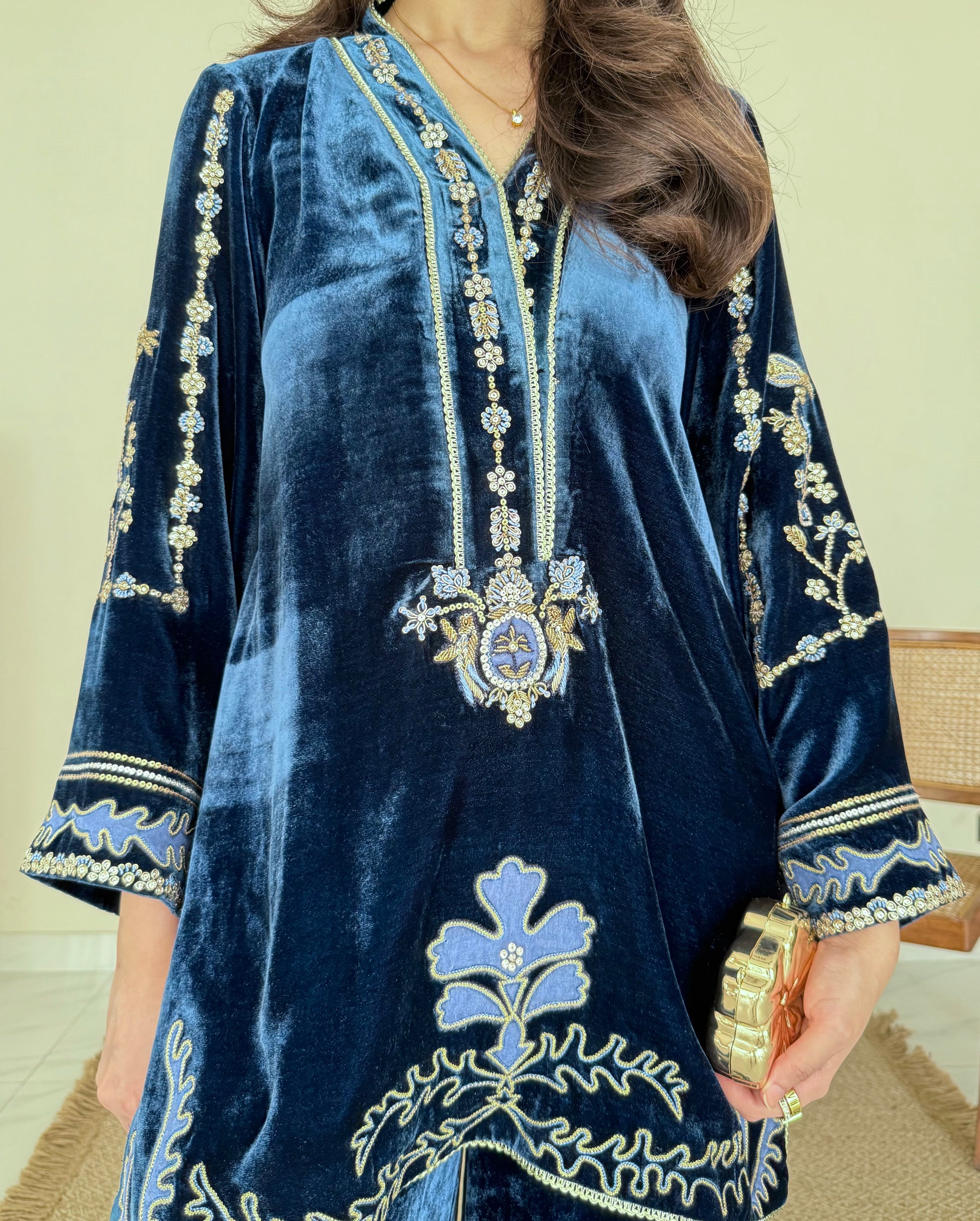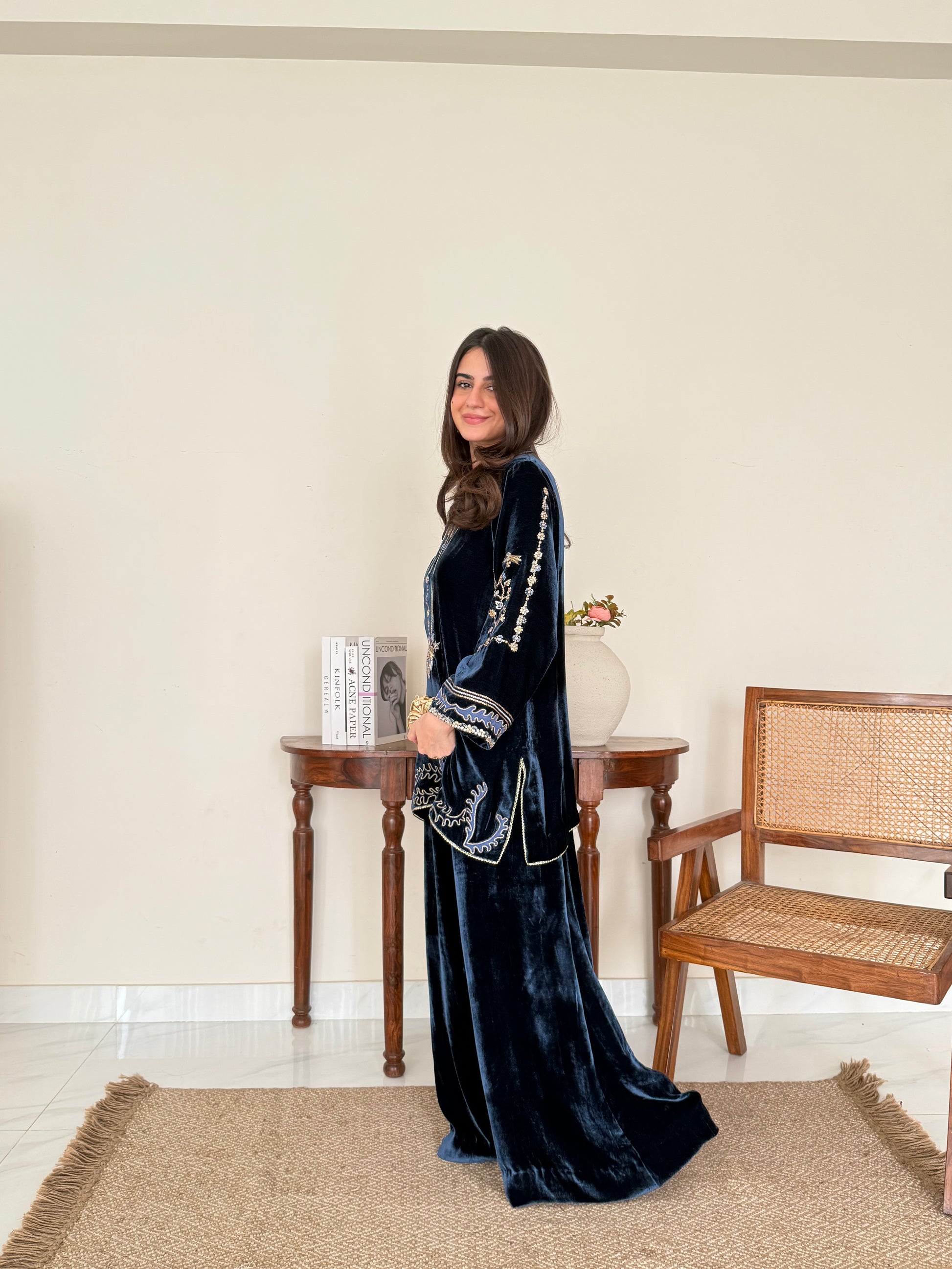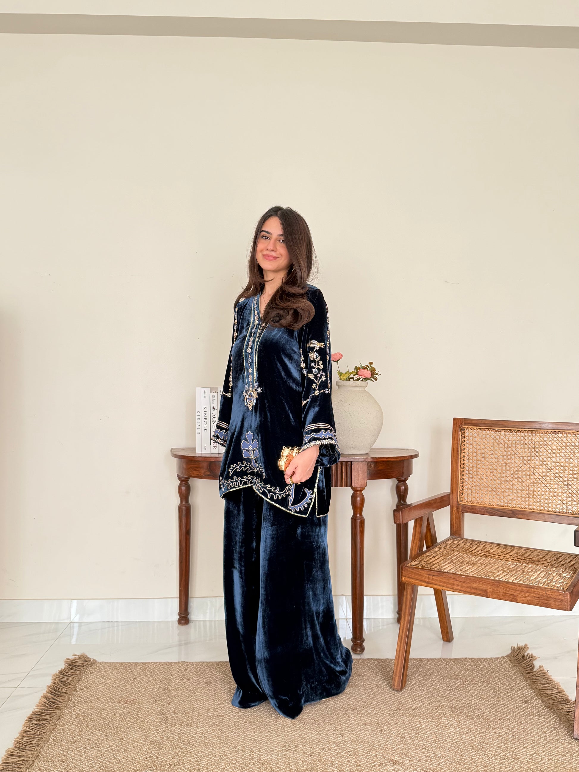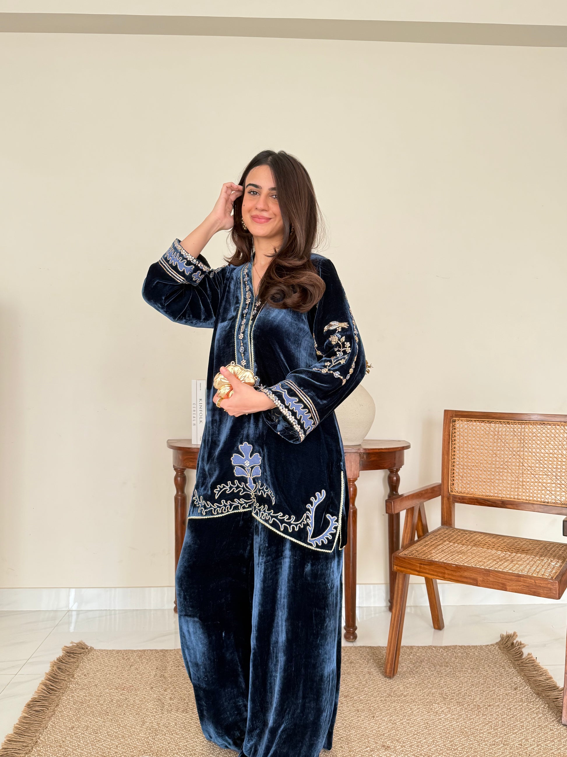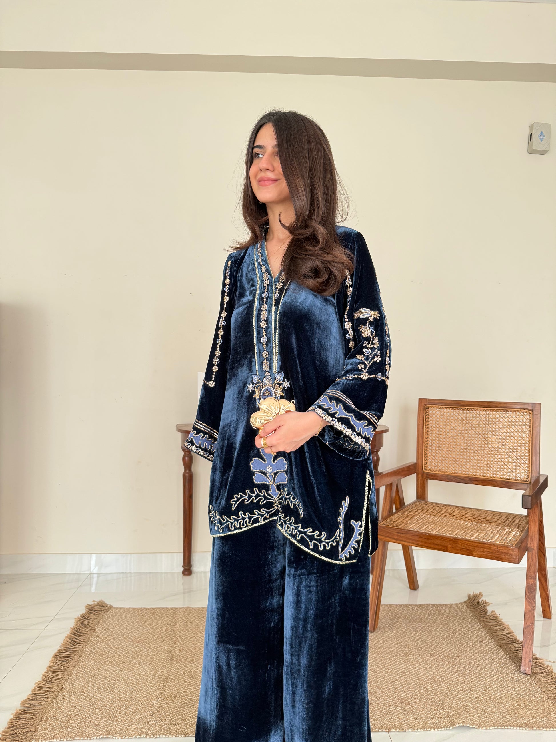 A nod to modern day glamour with our Ayra ensemble, perfect to carry you from day weddings to night festivities. A luminous velvet ensemble, in deep teal is lavishly adorned with hand embellished tilla, sequins, silk thread work and applique.The thigh skimming top is paired with wide leg flared pants in velvet, making it an absolute fabulous piece for any occasion.