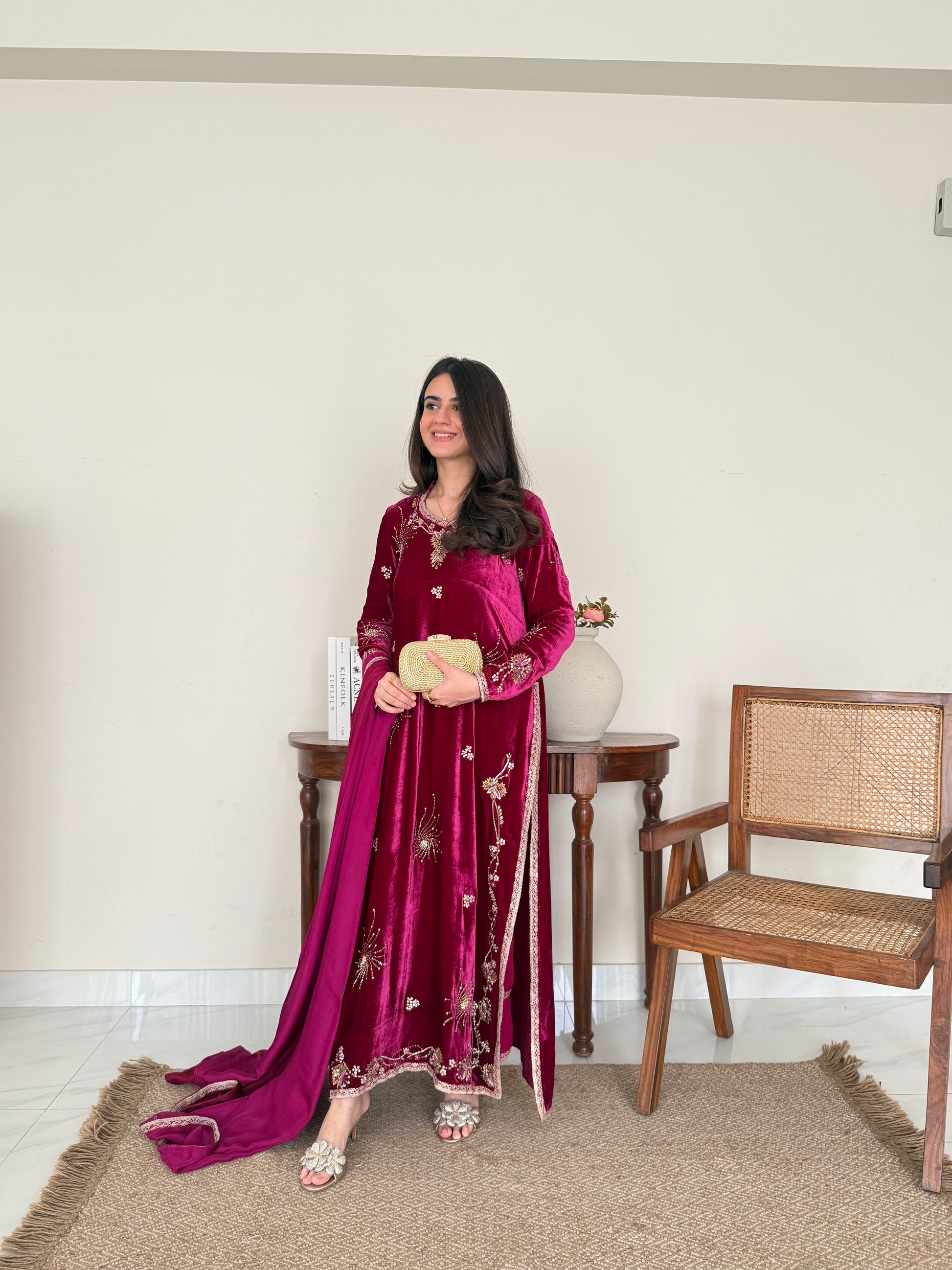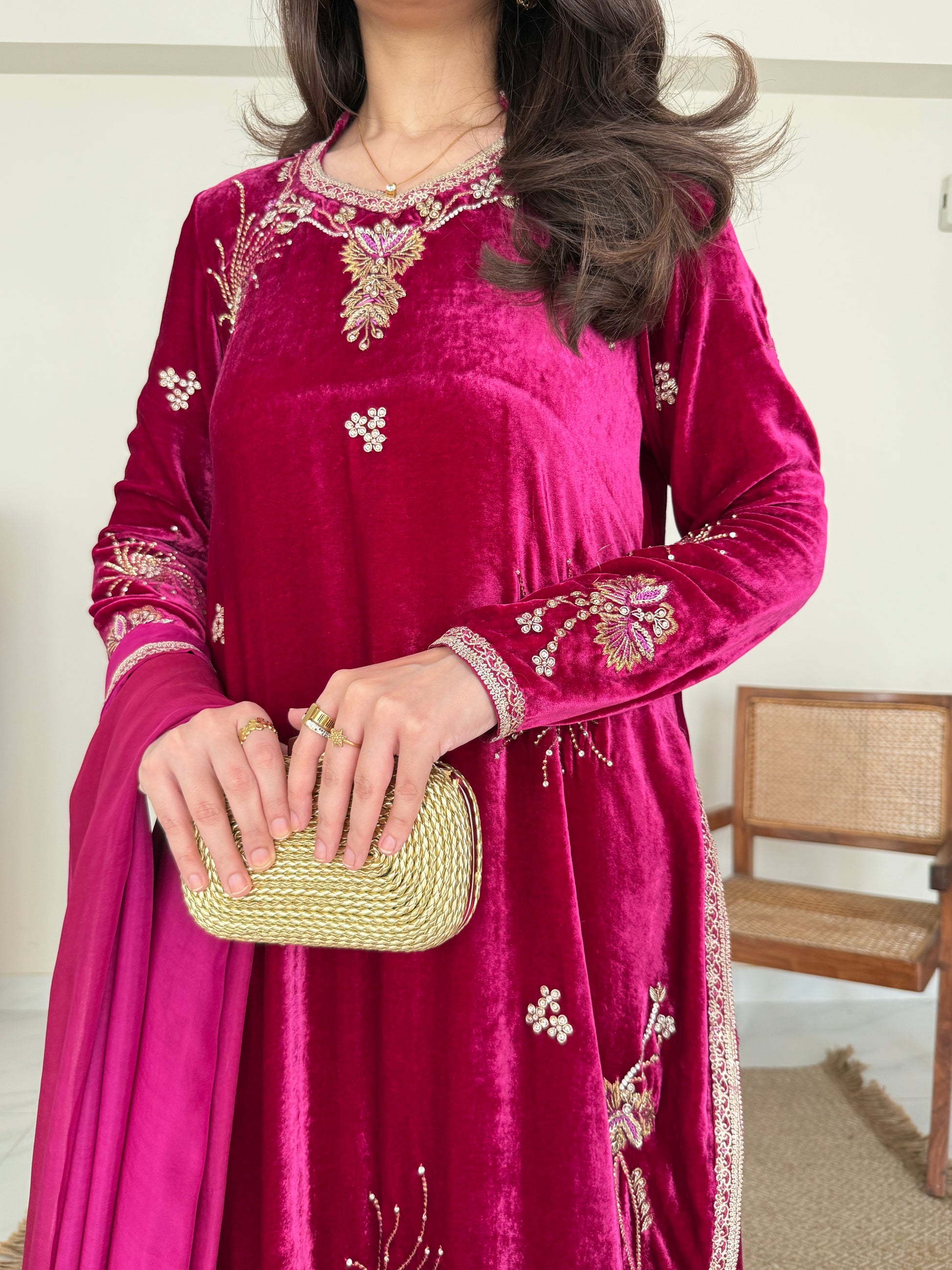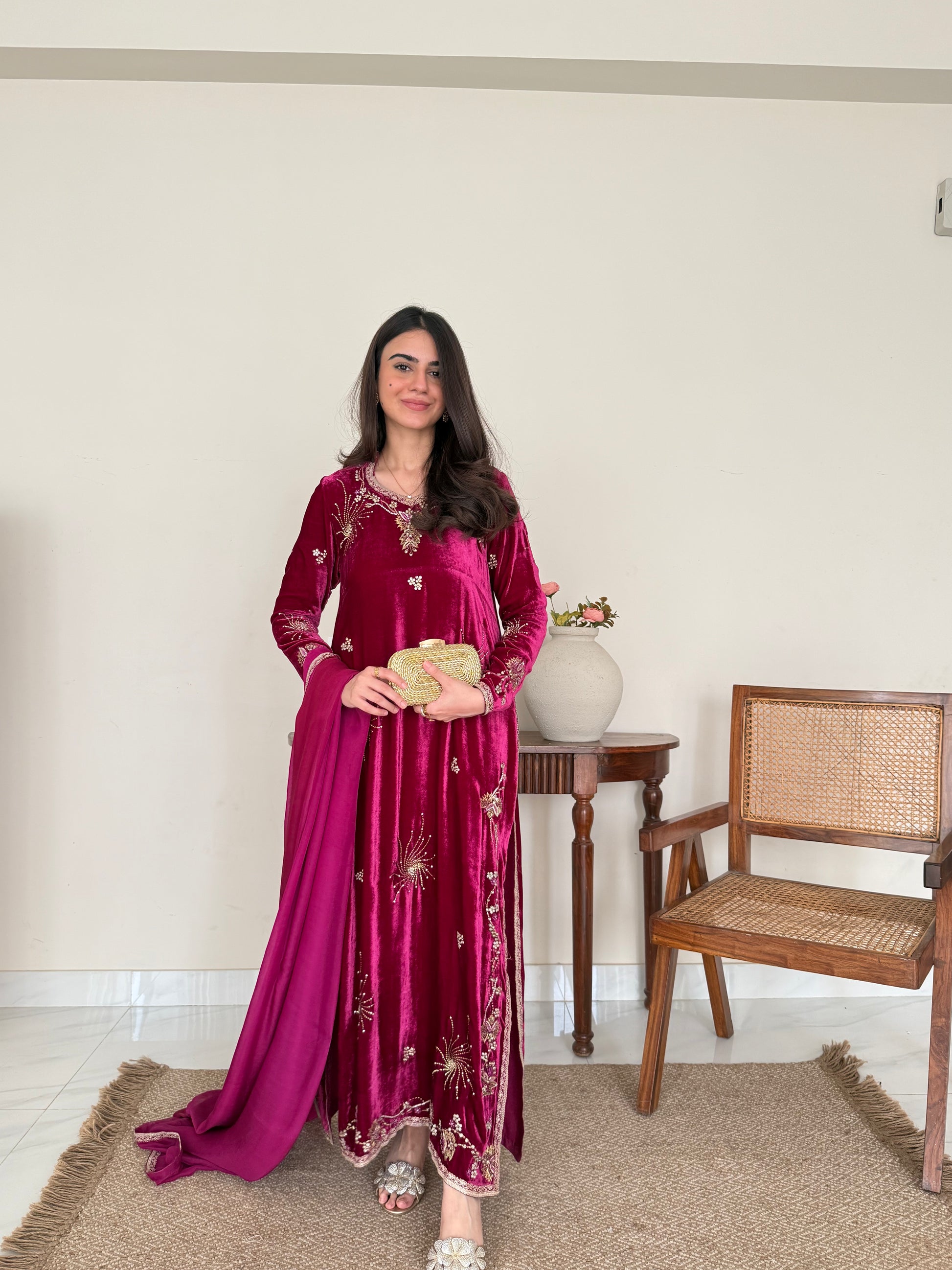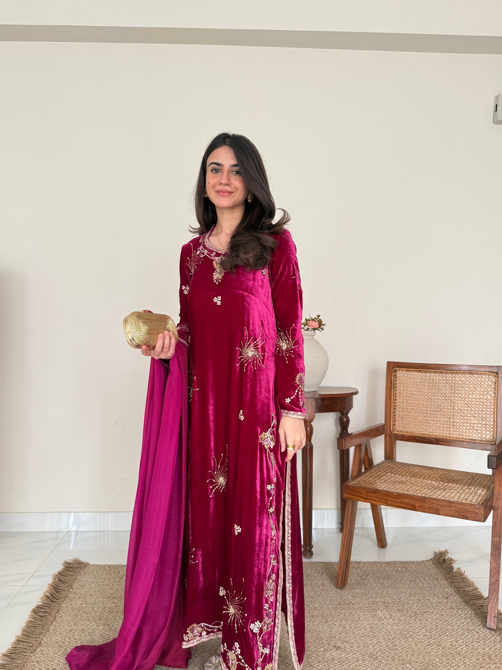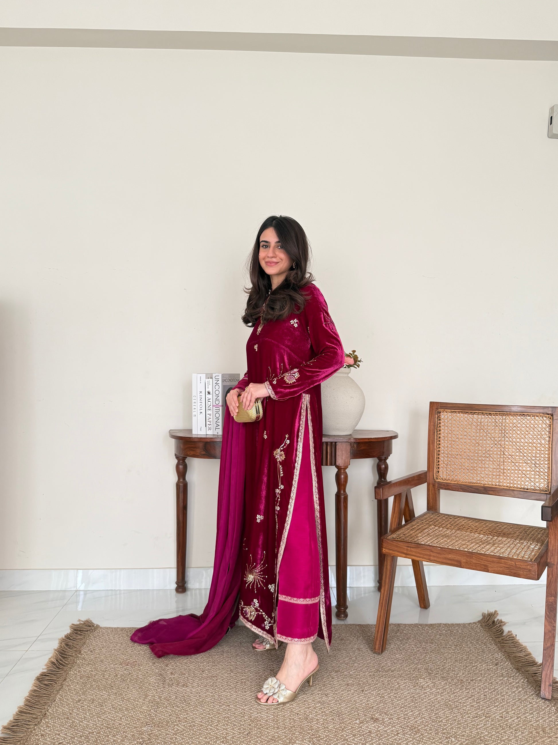 The ultimate must-have color for winter festivities. This forever flattering silhouette is cut from a plush velvet in the most beautiful shade of fushia pink. Adorned with intricate hand embroidery and silver embellishments on the neckline, slits and daaman.A pure medium silk dupatta in vibrant magenta hues, completes this outfit with unforgettable style.