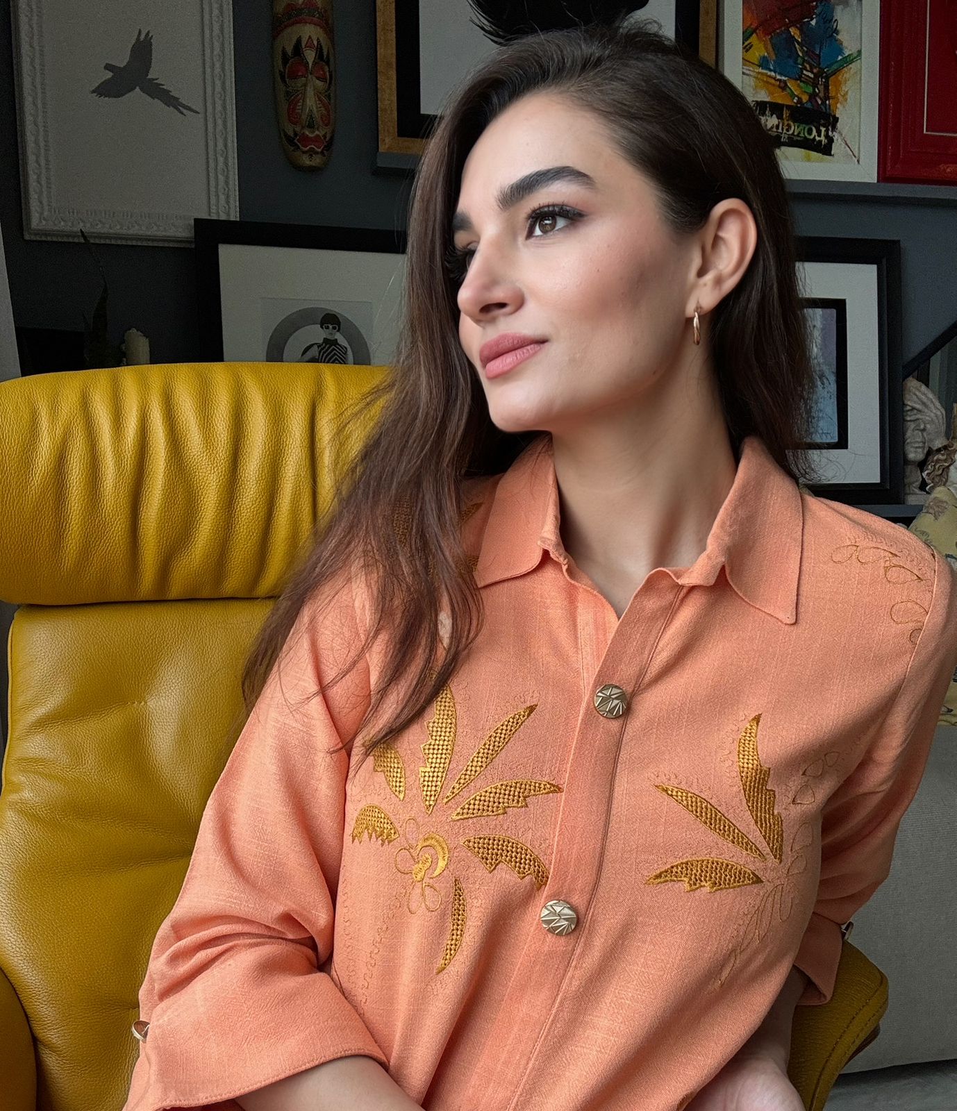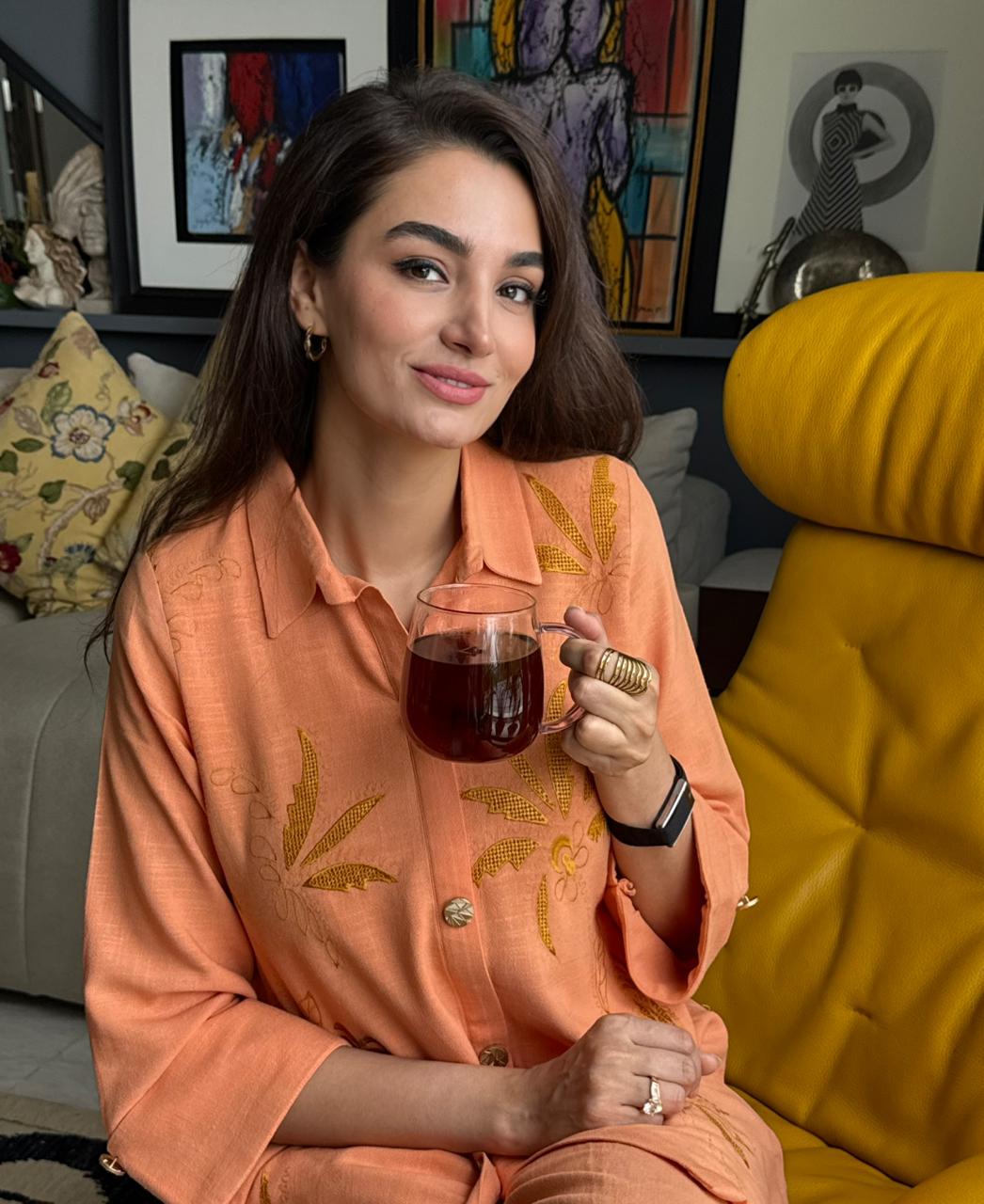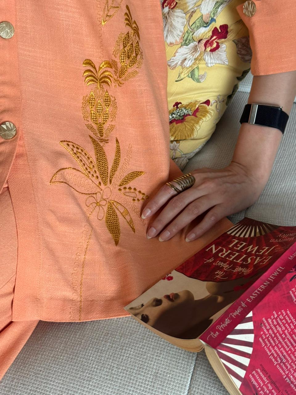 Burnt orange embroidered matching separate includes a shirt and pants.